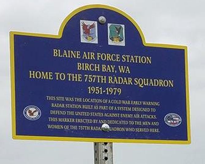 image linked to 757sign_close.jpg Blaine Air Force Station, aka the 757th Radar Squadron, was a small US Air Force installation located about a mile from Birch Bay, Washington, just south of the Canadian Border at Blaine Washington. This was a cold-war era radar site, whose mission was to look for hostile air traffic coming at us from over the horizon. As part of the SAGE system, there were height and search radars there, as well as radio gear to communicate with military aircraft in the area. With the end of the cold war came the end of the site's mission, and it was decommissioned in 1979. The nearest Air Force Base was McChord, near Tacoma WA, about 150 miles to the south.