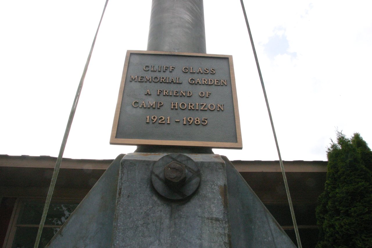 Sign reads: Cliff Glass Memorial Garden. A Friend of Camp Horizon - 1921-1985