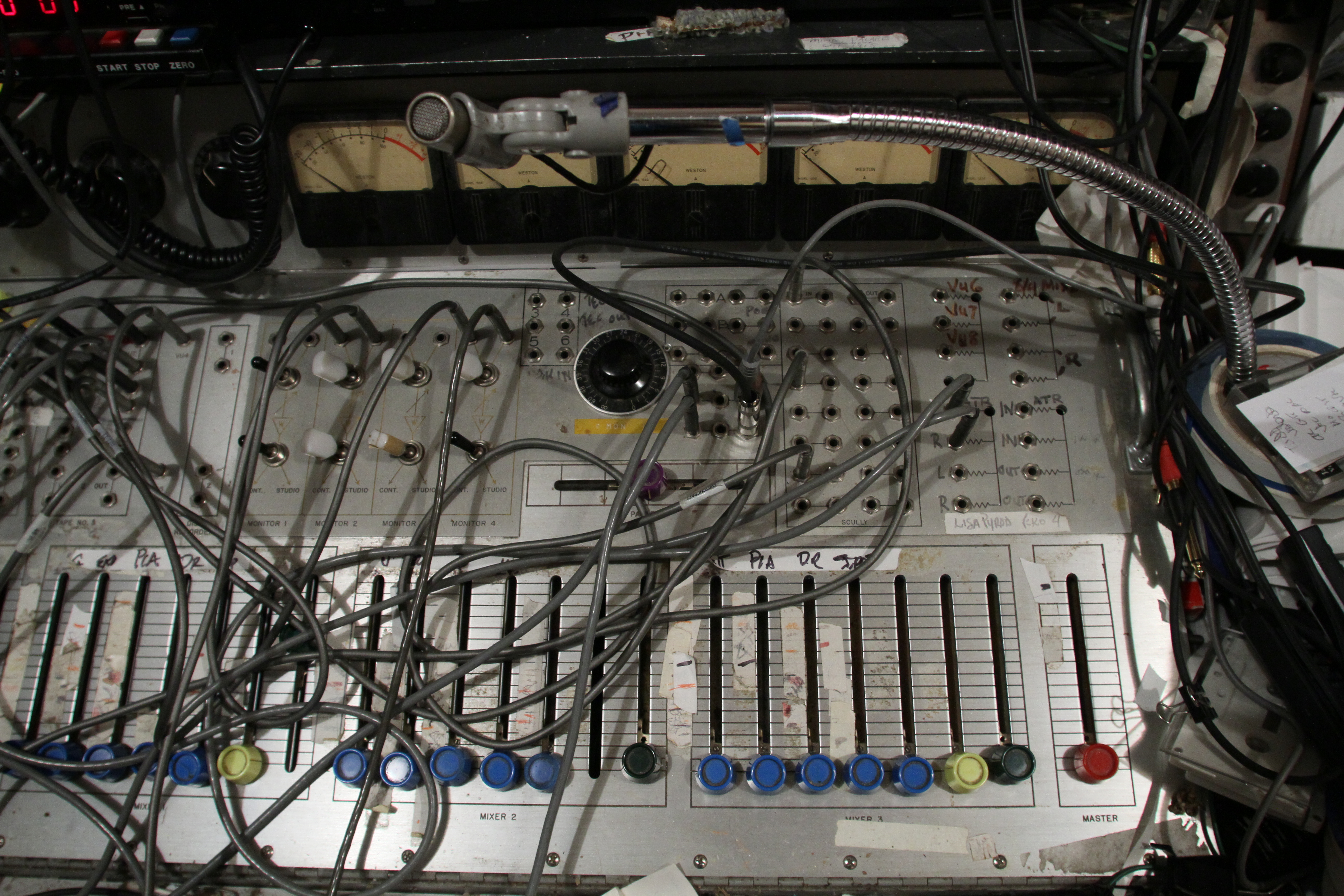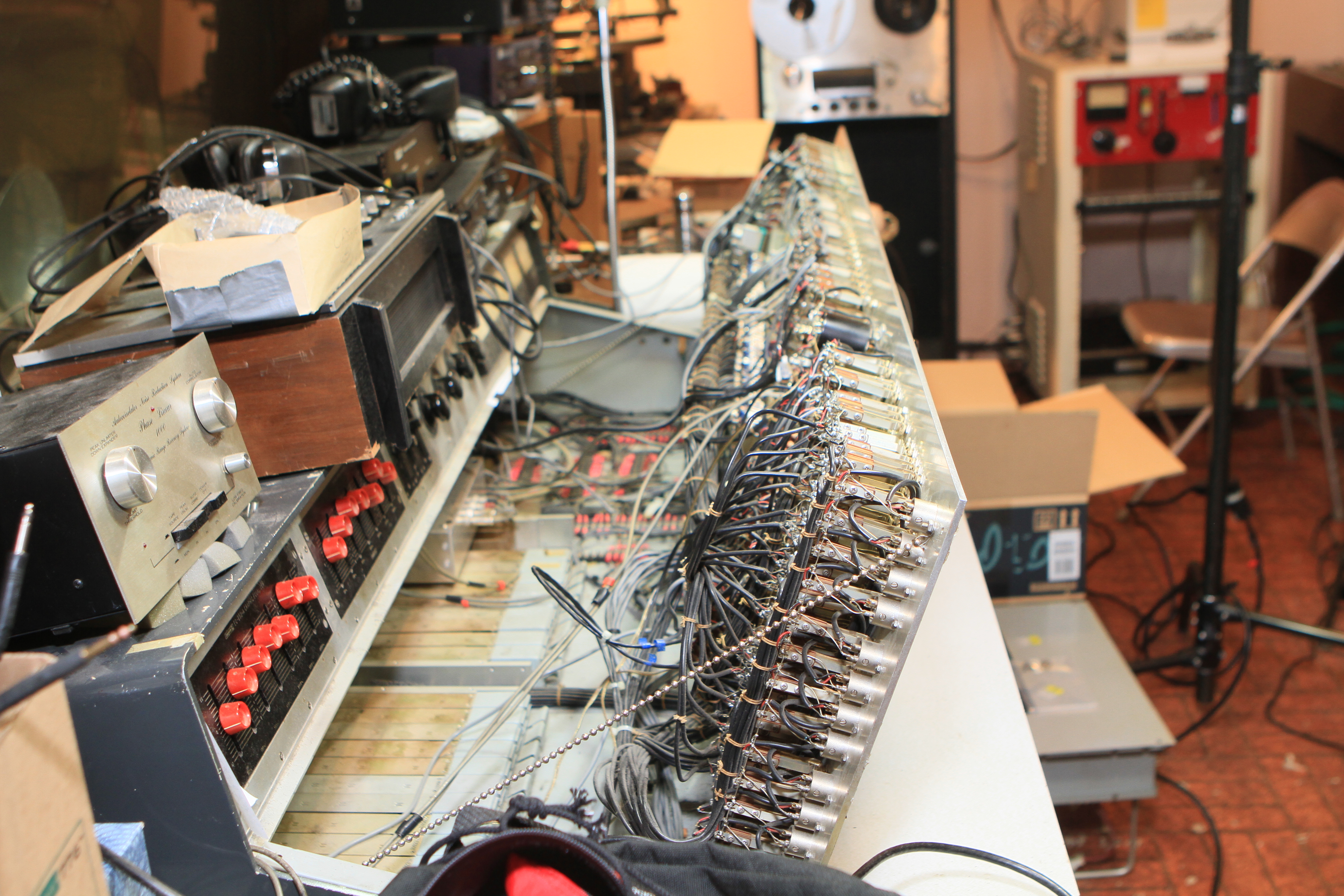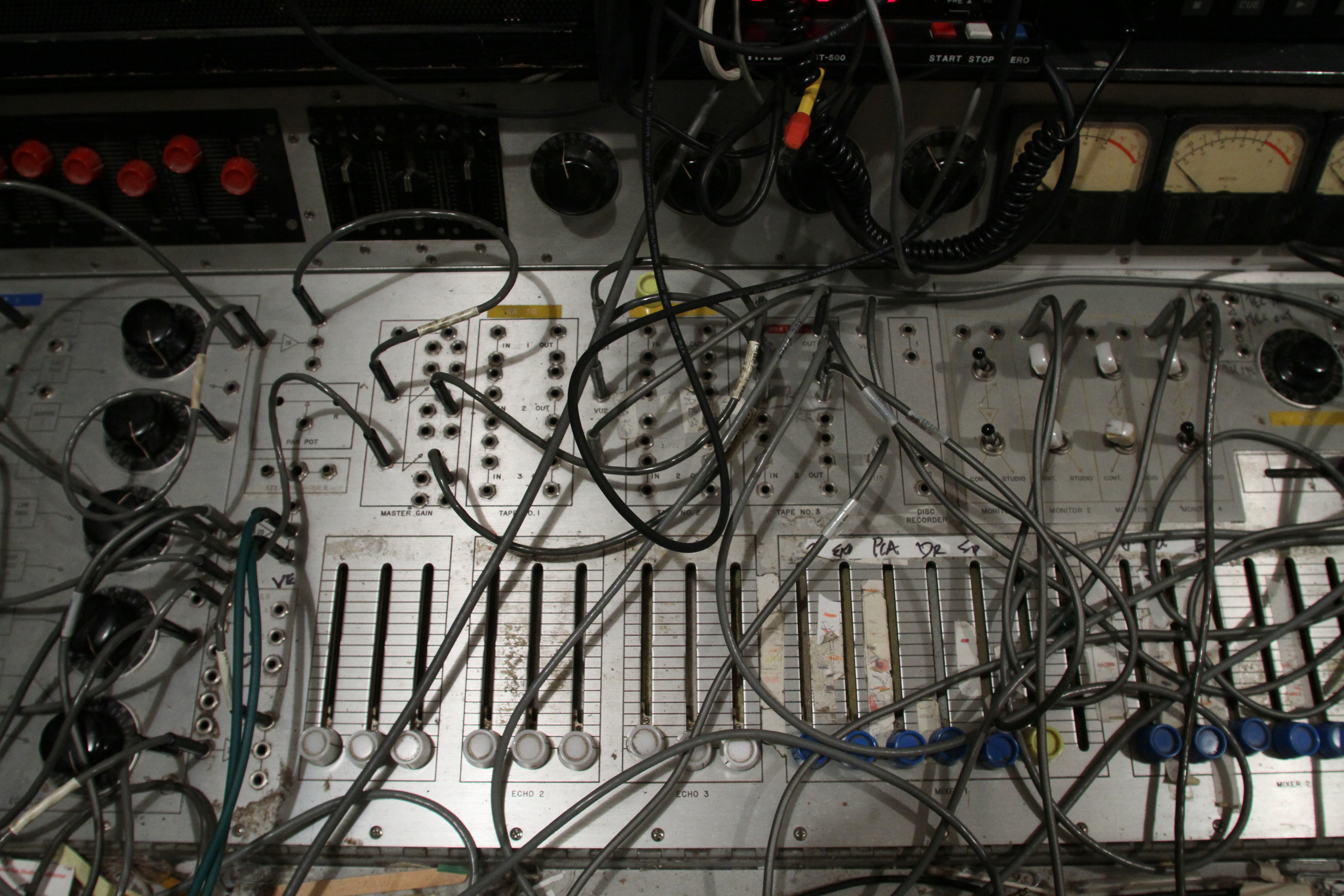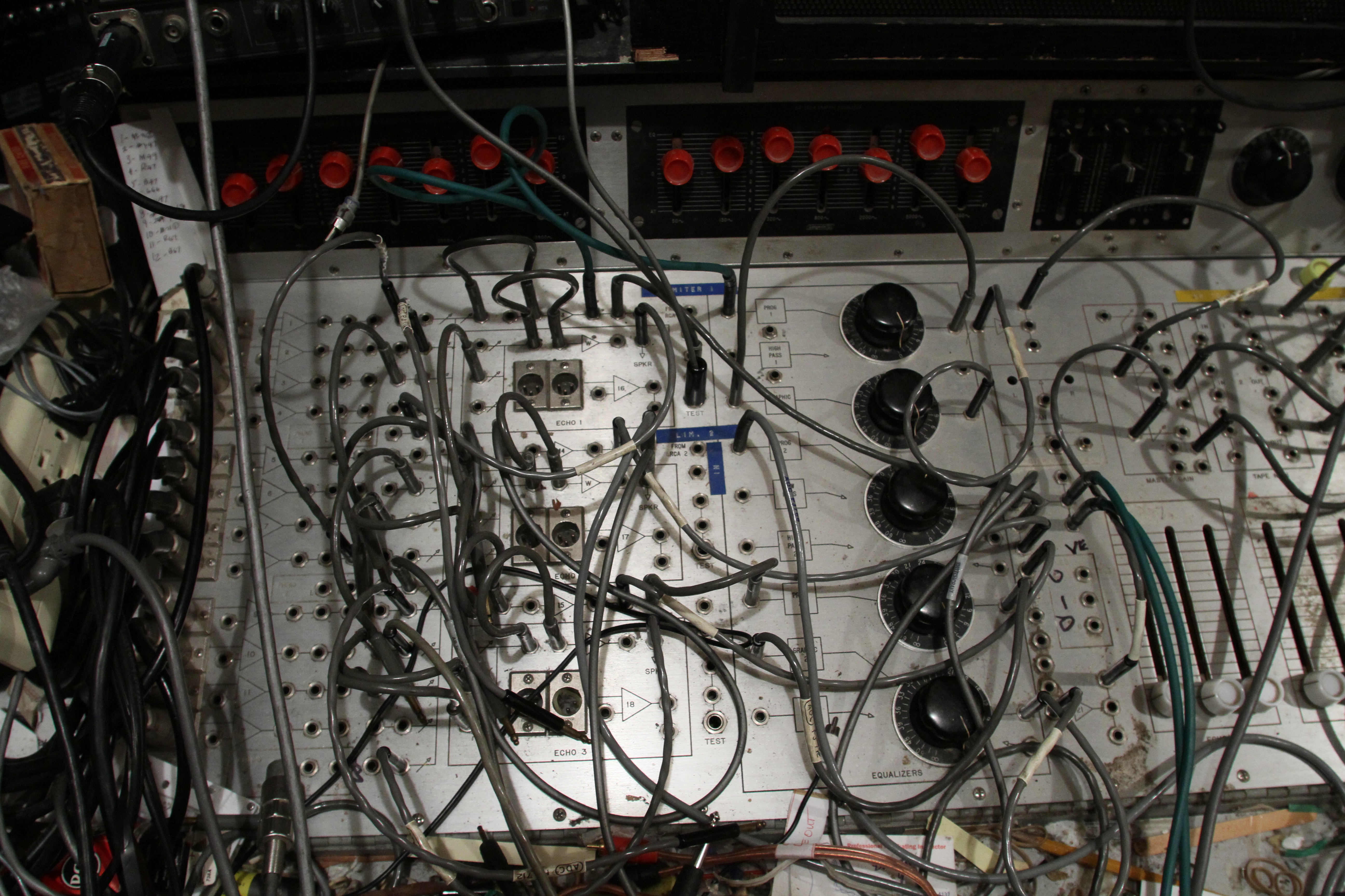 The ConsoleKearney's console was custom made for him by Glenn White Jr. and Ken Heidt using Langevin components. It's a classic piece of minimalist engineering. I needed to document the mixer/console so it could be sold. This is a really unusual piece because there isn't any switching; the signal flow diagram is engraved into the panel, and all of the signal flow is via TT patch cords. This is really intuitive to anyone with any signal flow sense, and probably completely impenetrable by anyone who really doesn't understand signal flow. In it's usual operating mode, STUN, it's covered with patch cables, and only the area where the faders are is really accessible. There's no per-channel equalization because even the Langevin 251 program equalizers were $270 and the EQ253 graphic equalizers were $600... and those were in 1963 dollars! Thus, this mixer has 2 graphic equalizers and 3 program equalizers, and you patch them in where they are needed. The result is a mixer whose signal path is about as minimalist as you could ever make, and there's no extra BS anywhere. This suited Kearney's style to a T. Finally, don't forget that in 1965, when this mixer was built, the studio had a 3-track machine. It was some time before he got an 8-track, and that's as far as it ever went.The Rest of the StoryIn the end, nobody came forward with a serious Jones for this mixer, and it went on eBay. That got it the exposure needed to find someone to buy it. And buy it they did. Finally, in late April, I got the mixer crated, and it was shipped to its new home in Nashville, where it will go on making music for its new owner. Oddly, the new owner is a past resident of the Seattle area and knew about Kearney and the mixer.Someone asked why the mixer wasn't headed for EMP. I think that everyone involved really wanted to see it go on making music. At EMP, it would have just become another artifact, something to be seen but not heard. That's the hard way to check out of this world. |