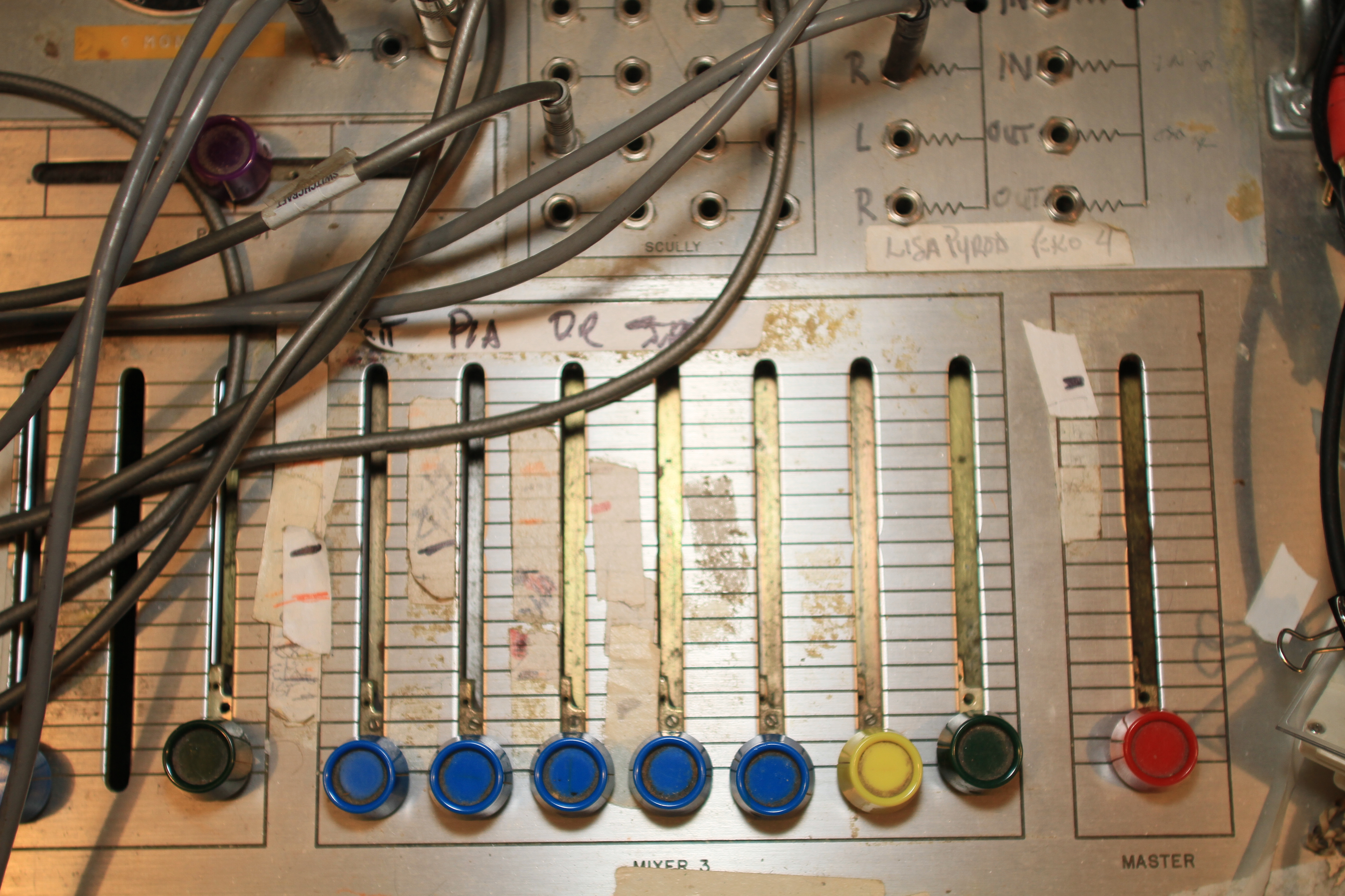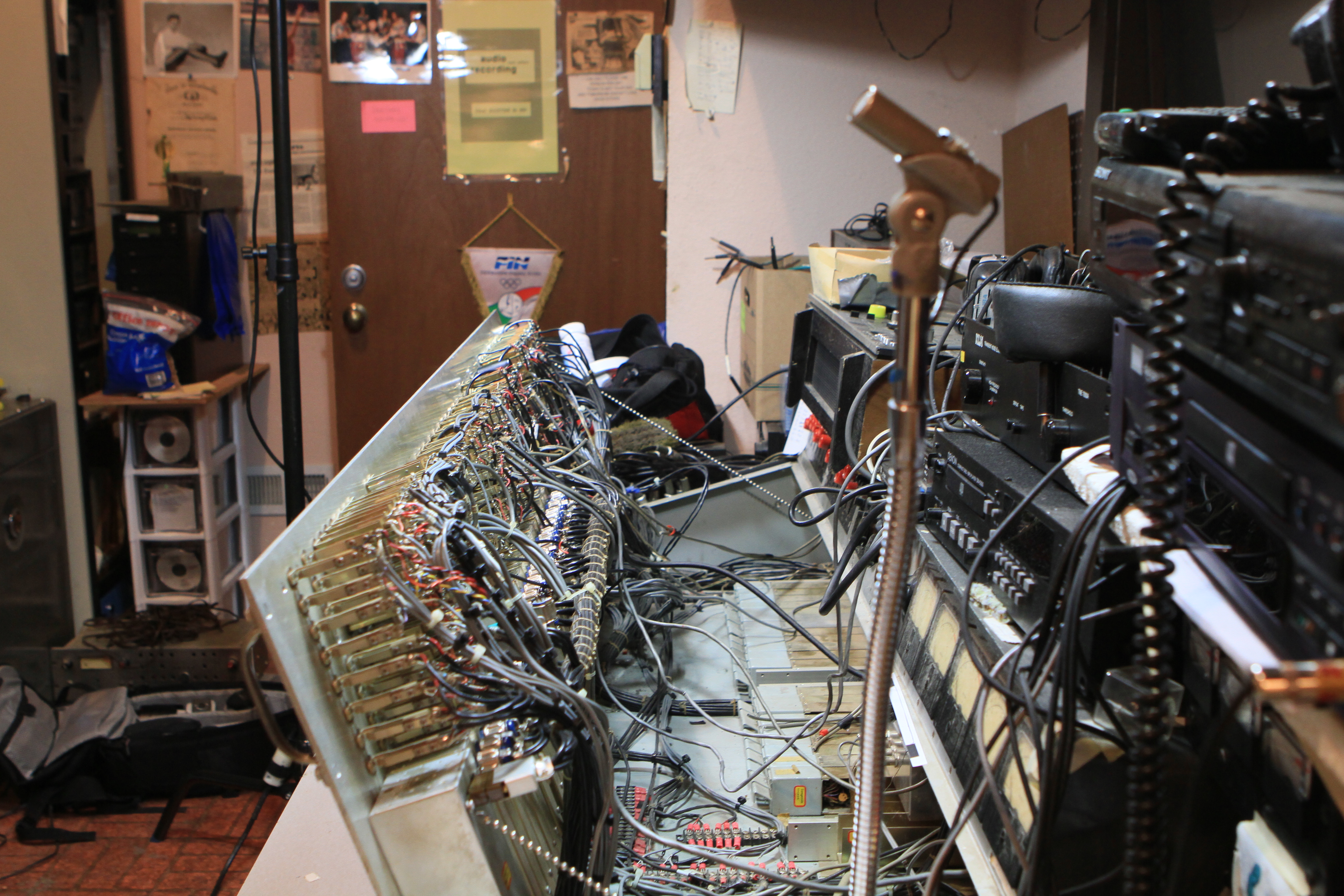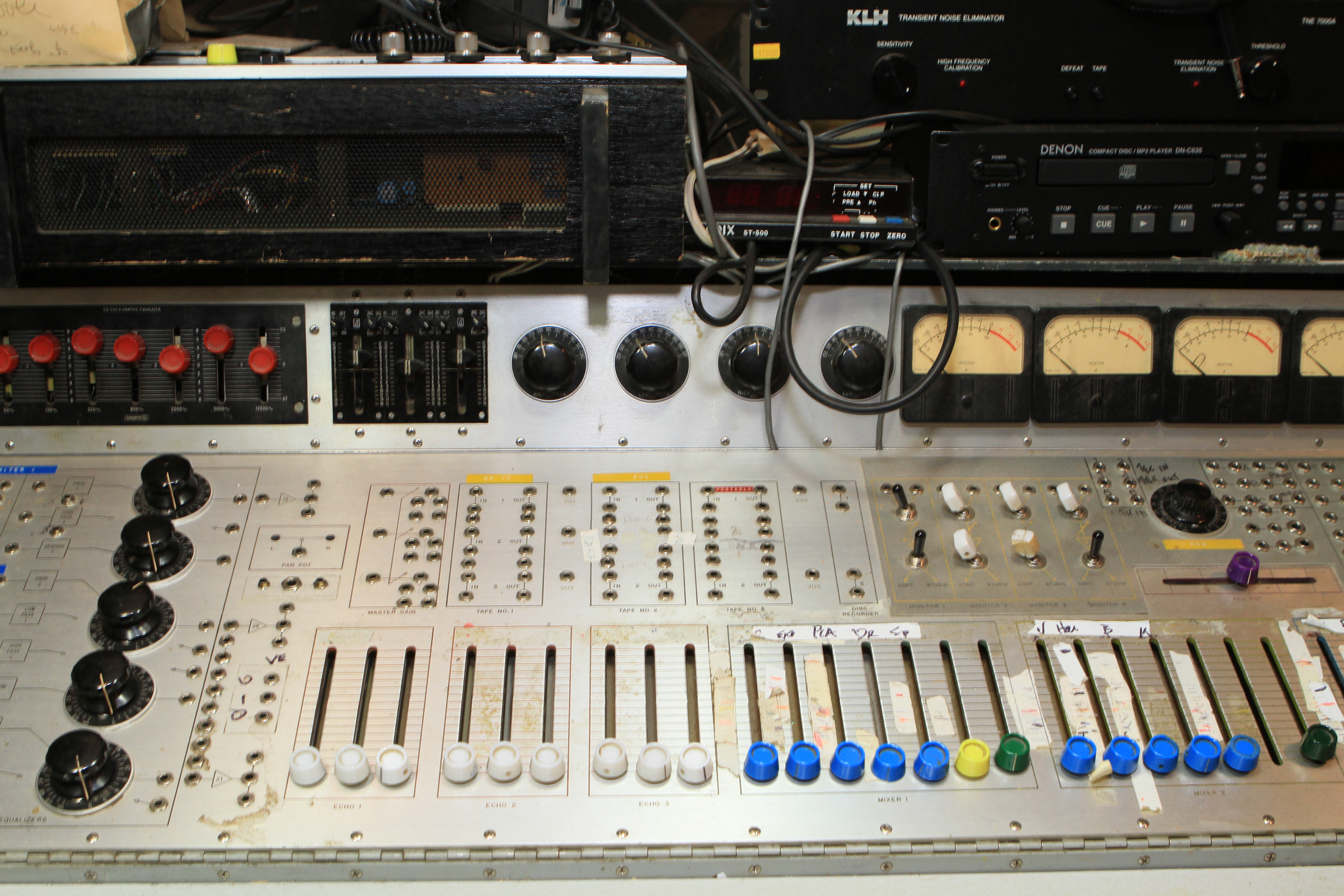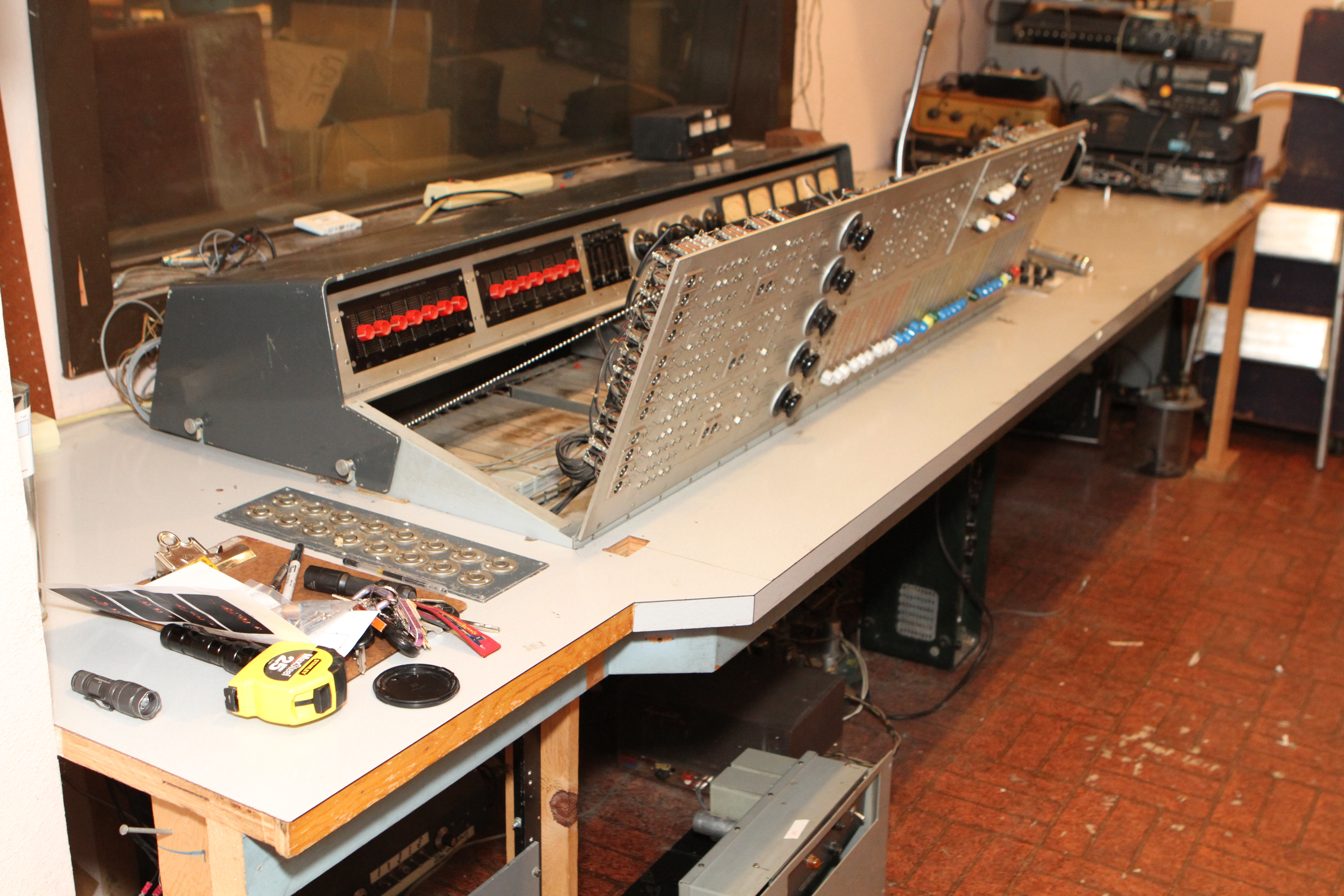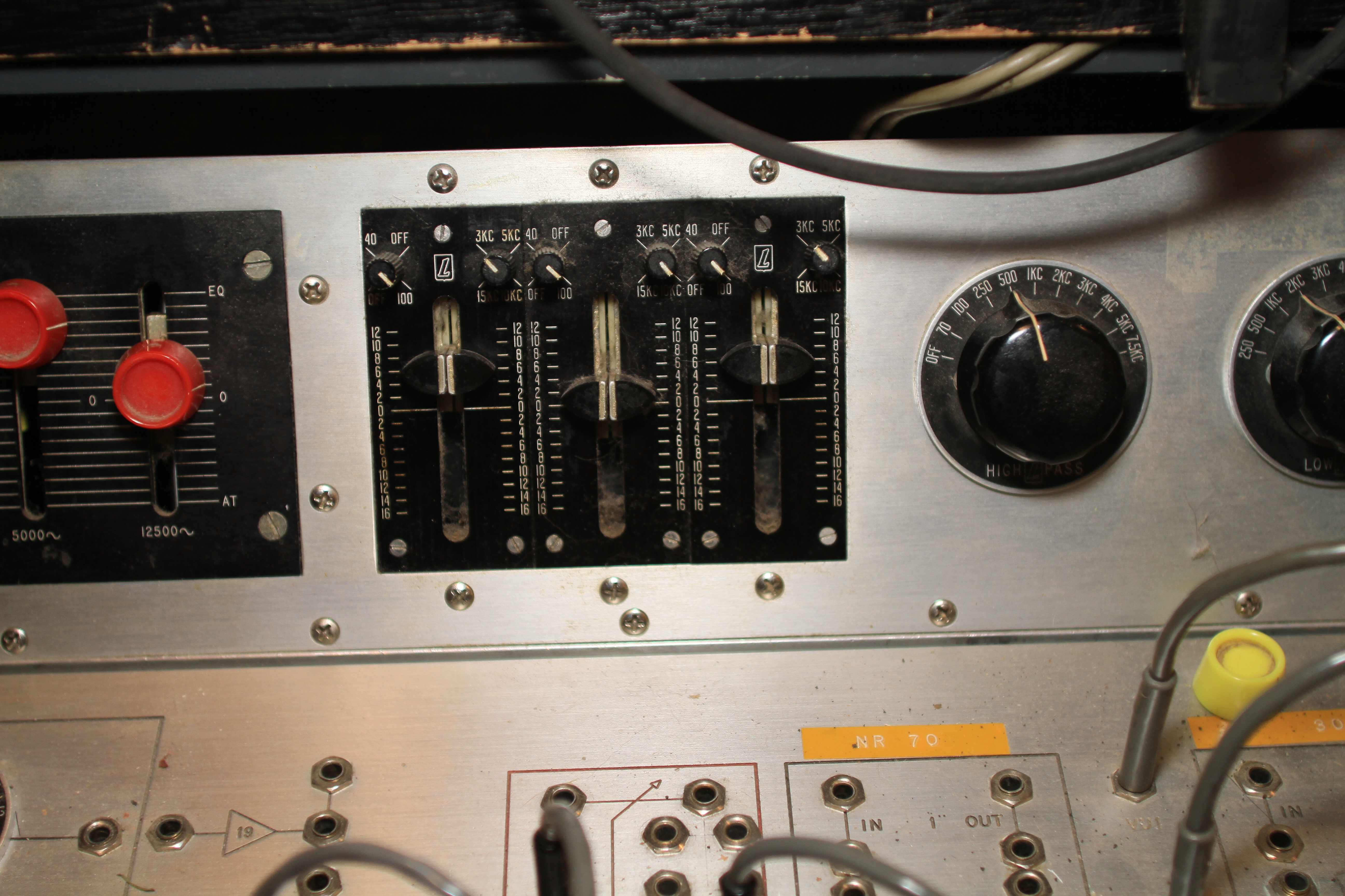 The ConsoleKearney's console was custom made for him by Glenn White Jr. and Ken Heidt using Langevin components. It's a classic piece of minimalist engineering. I needed to document the mixer/console so it could be sold. This is a really unusual piece because there isn't any switching; the signal flow diagram is engraved into the panel, and all of the signal flow is via TT patch cords. This is really intuitive to anyone with any signal flow sense, and probably completely impenetrable by anyone who really doesn't understand signal flow. In it's usual operating mode, STUN, it's covered with patch cables, and only the area where the faders are is really accessible. There's no per-channel equalization because even the Langevin 251 program equalizers were $270 and the EQ253 graphic equalizers were $600... and those were in 1963 dollars! Thus, this mixer has 2 graphic equalizers and 3 program equalizers, and you patch them in where they are needed. The result is a mixer whose signal path is about as minimalist as you could ever make, and there's no extra BS anywhere. This suited Kearney's style to a T. Finally, don't forget that in 1965, when this mixer was built, the studio had a 3-track machine. It was some time before he got an 8-track, and that's as far as it ever went.The Rest of the StoryIn the end, nobody came forward with a serious Jones for this mixer, and it went on eBay. That got it the exposure needed to find someone to buy it. And buy it they did. Finally, in late April, I got the mixer crated, and it was shipped to its new home in Nashville, where it will go on making music for its new owner. Oddly, the new owner is a past resident of the Seattle area and knew about Kearney and the mixer.Someone asked why the mixer wasn't headed for EMP. I think that everyone involved really wanted to see it go on making music. At EMP, it would have just become another artifact, something to be seen but not heard. That's the hard way to check out of this world. |
