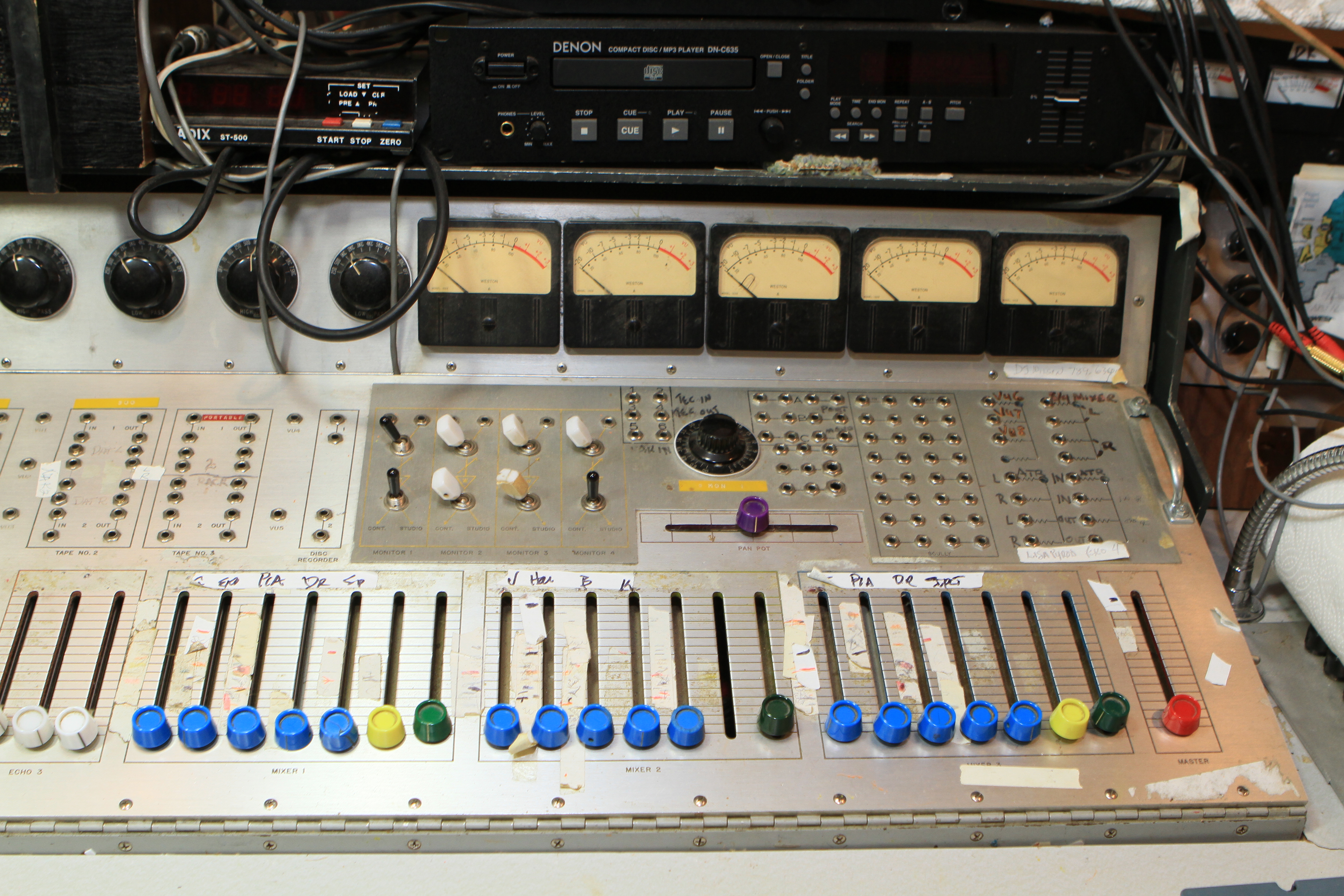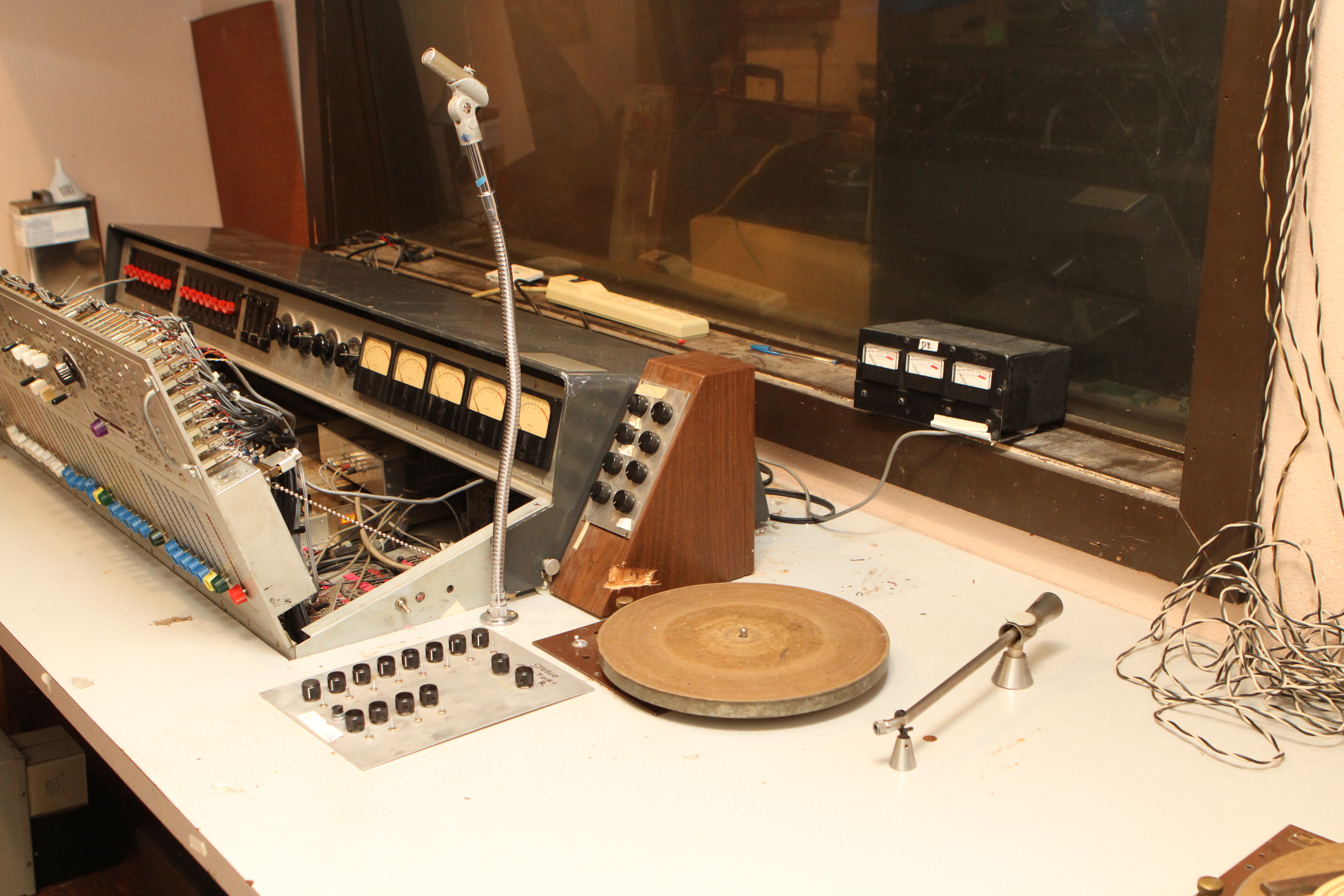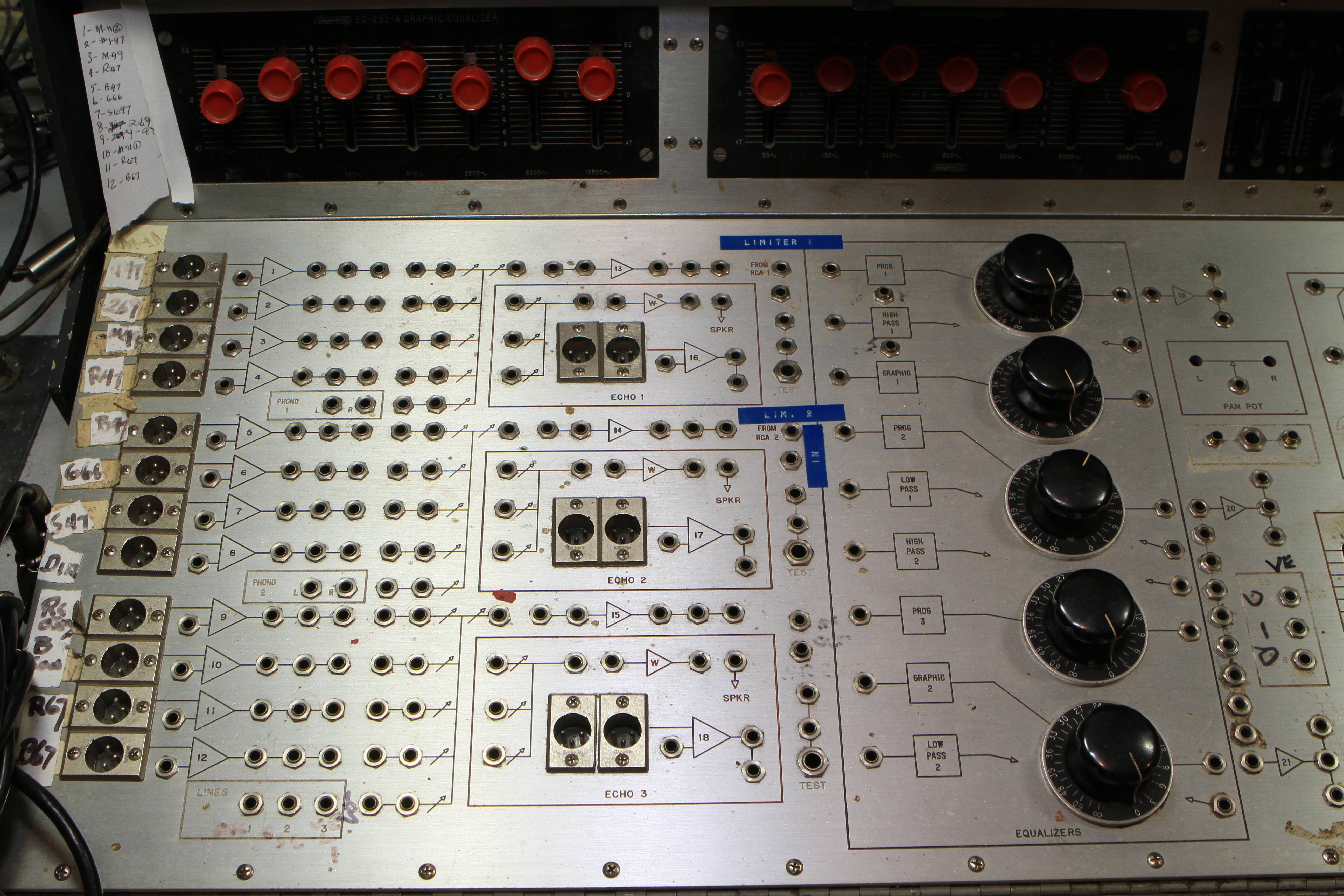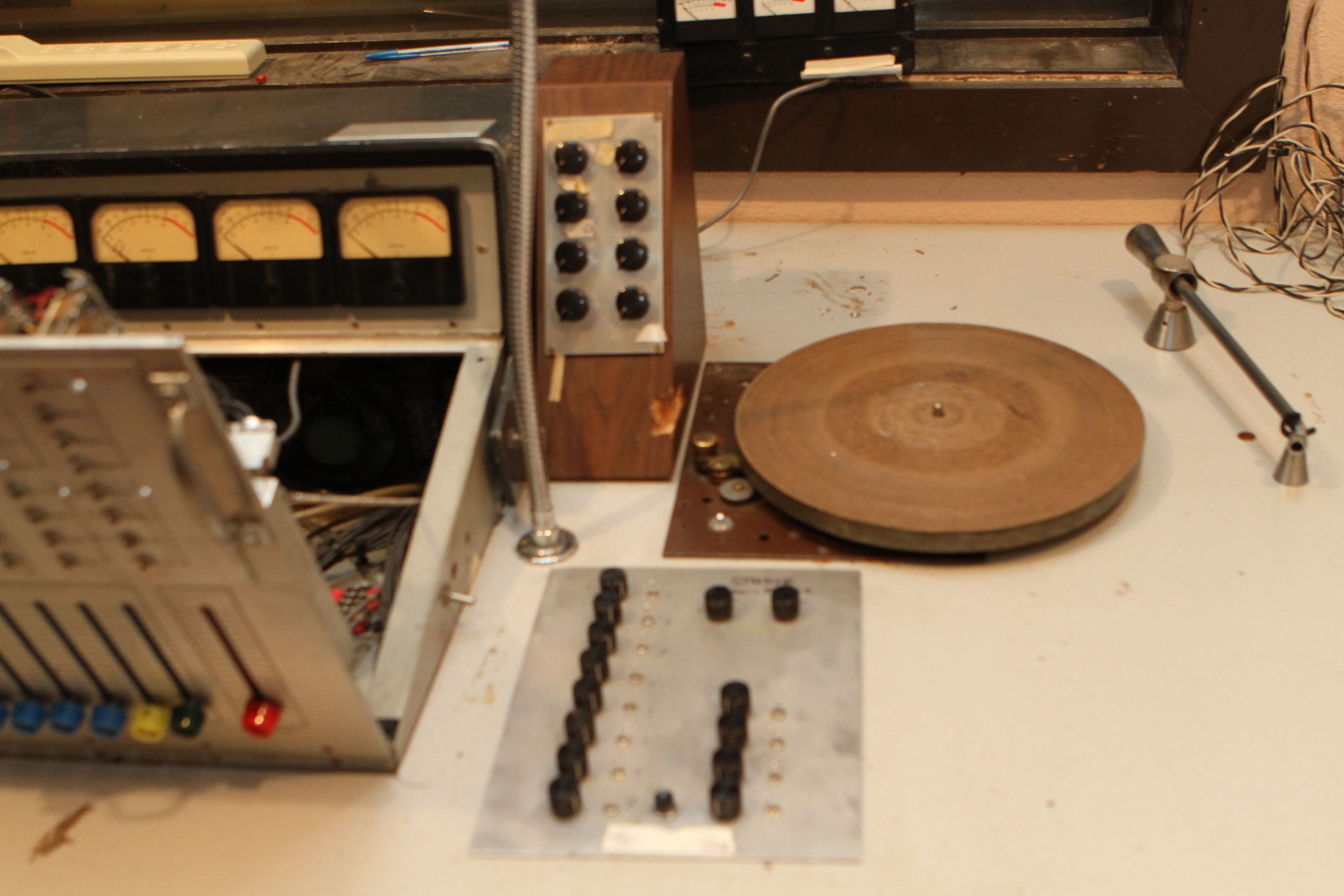 The ConsoleKearney's console was custom made for him by Glenn White Jr. and Ken Heidt using Langevin components. It's a classic piece of minimalist engineering. I needed to document the mixer/console so it could be sold. This is a really unusual piece because there isn't any switching; the signal flow diagram is engraved into the panel, and all of the signal flow is via TT patch cords. This is really intuitive to anyone with any signal flow sense, and probably completely impenetrable by anyone who really doesn't understand signal flow. In it's usual operating mode, STUN, it's covered with patch cables, and only the area where the faders are is really accessible. There's no per-channel equalization because even the Langevin 251 program equalizers were $270 and the EQ253 graphic equalizers were $600... and those were in 1963 dollars! Thus, this mixer has 2 graphic equalizers and 3 program equalizers, and you patch them in where they are needed. The result is a mixer whose signal path is about as minimalist as you could ever make, and there's no extra BS anywhere. This suited Kearney's style to a T. Finally, don't forget that in 1965, when this mixer was built, the studio had a 3-track machine. It was some time before he got an 8-track, and that's as far as it ever went.The Rest of the StoryIn the end, nobody came forward with a serious Jones for this mixer, and it went on eBay. That got it the exposure needed to find someone to buy it. And buy it they did. Finally, in late April, I got the mixer crated, and it was shipped to its new home in Nashville, where it will go on making music for its new owner. Oddly, the new owner is a past resident of the Seattle area and knew about Kearney and the mixer.Someone asked why the mixer wasn't headed for EMP. I think that everyone involved really wanted to see it go on making music. At EMP, it would have just become another artifact, something to be seen but not heard. That's the hard way to check out of this world. |
