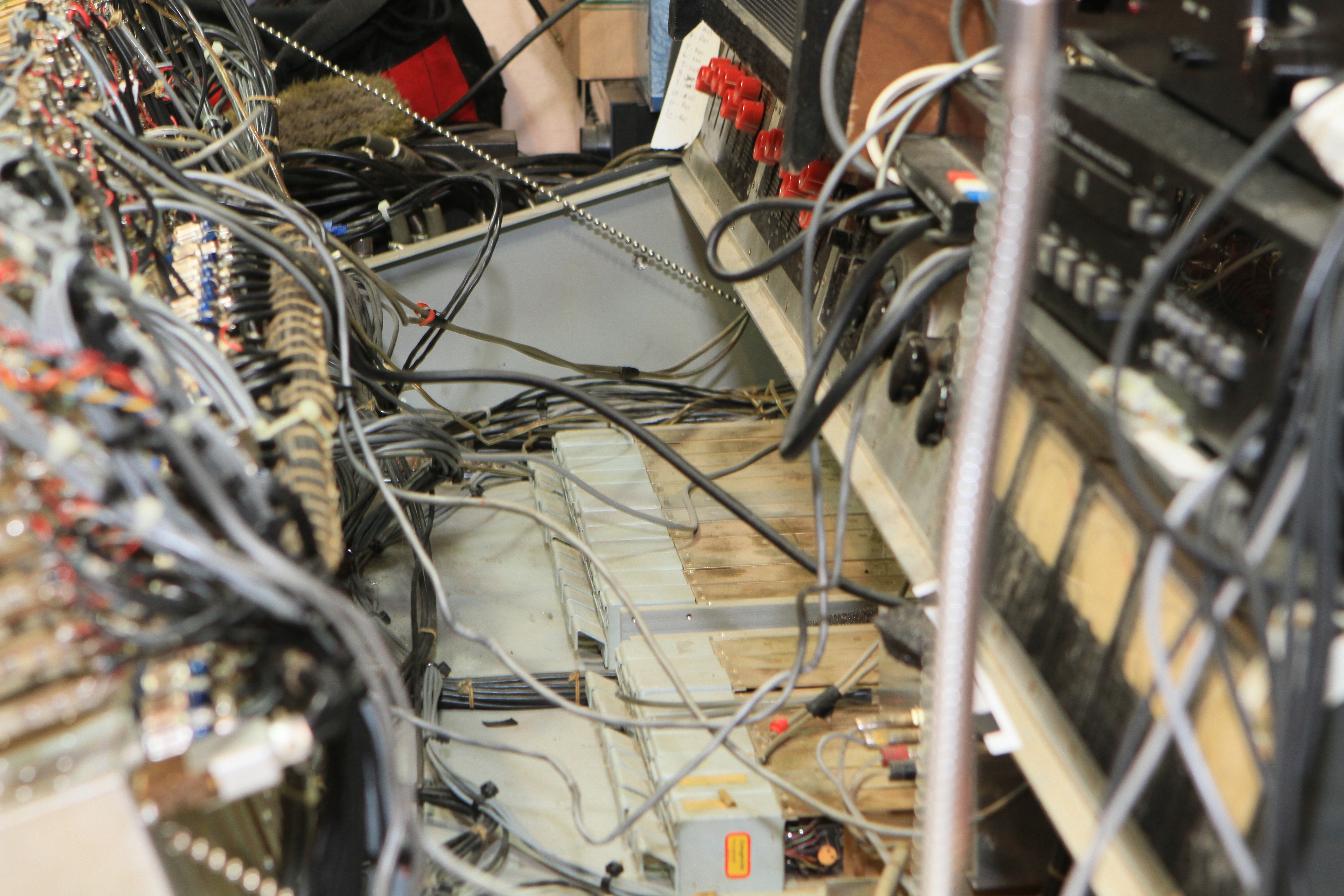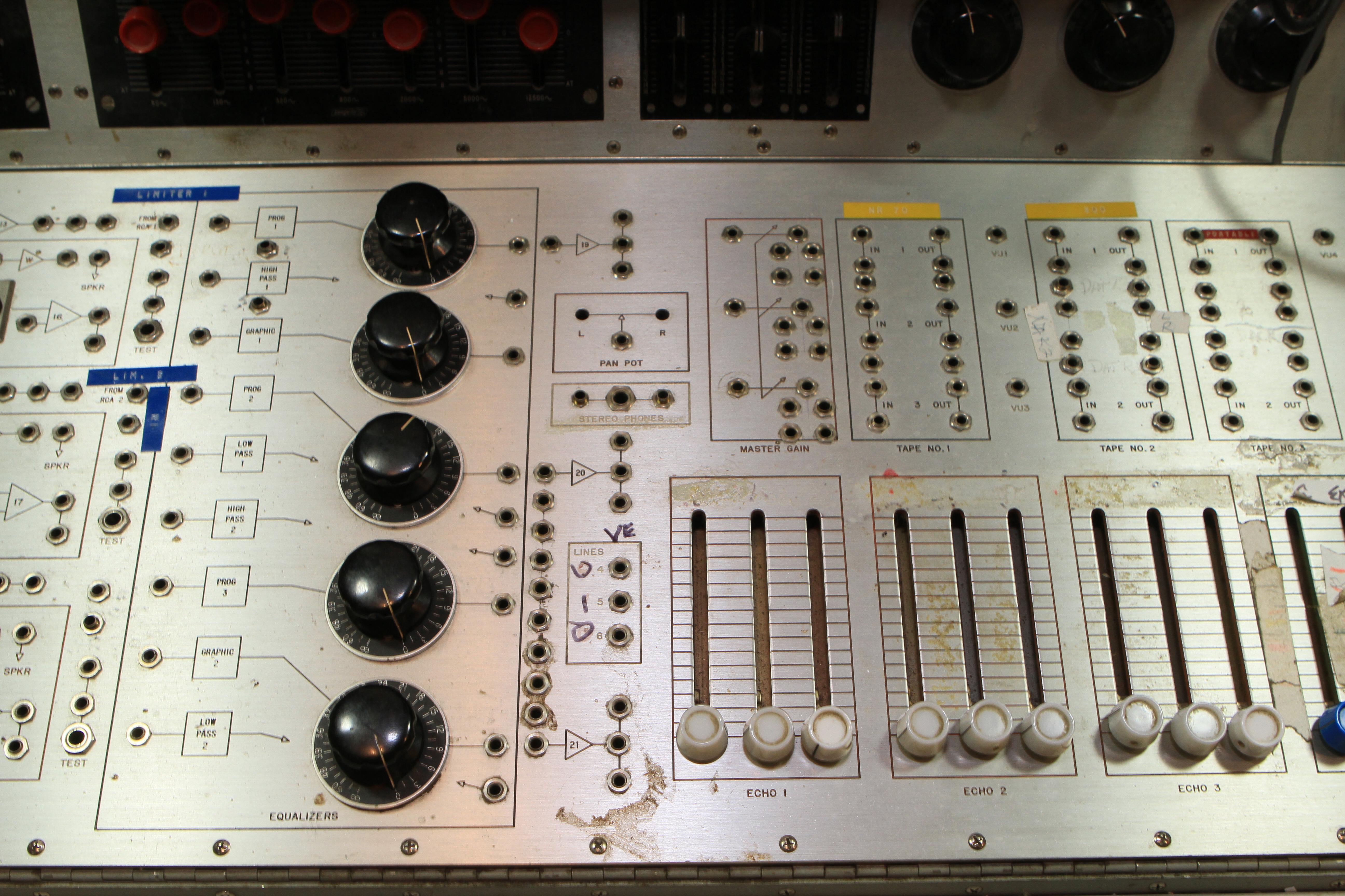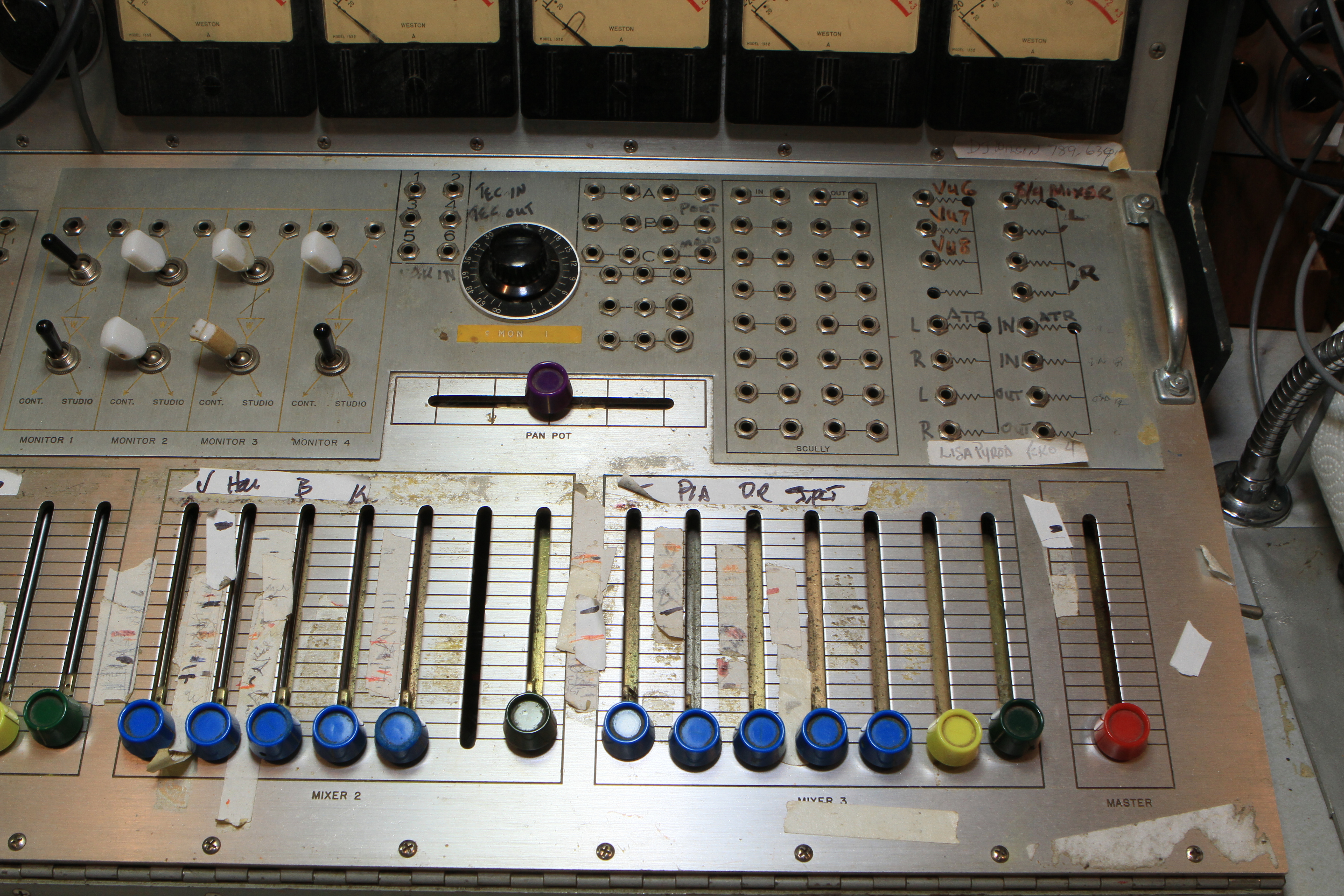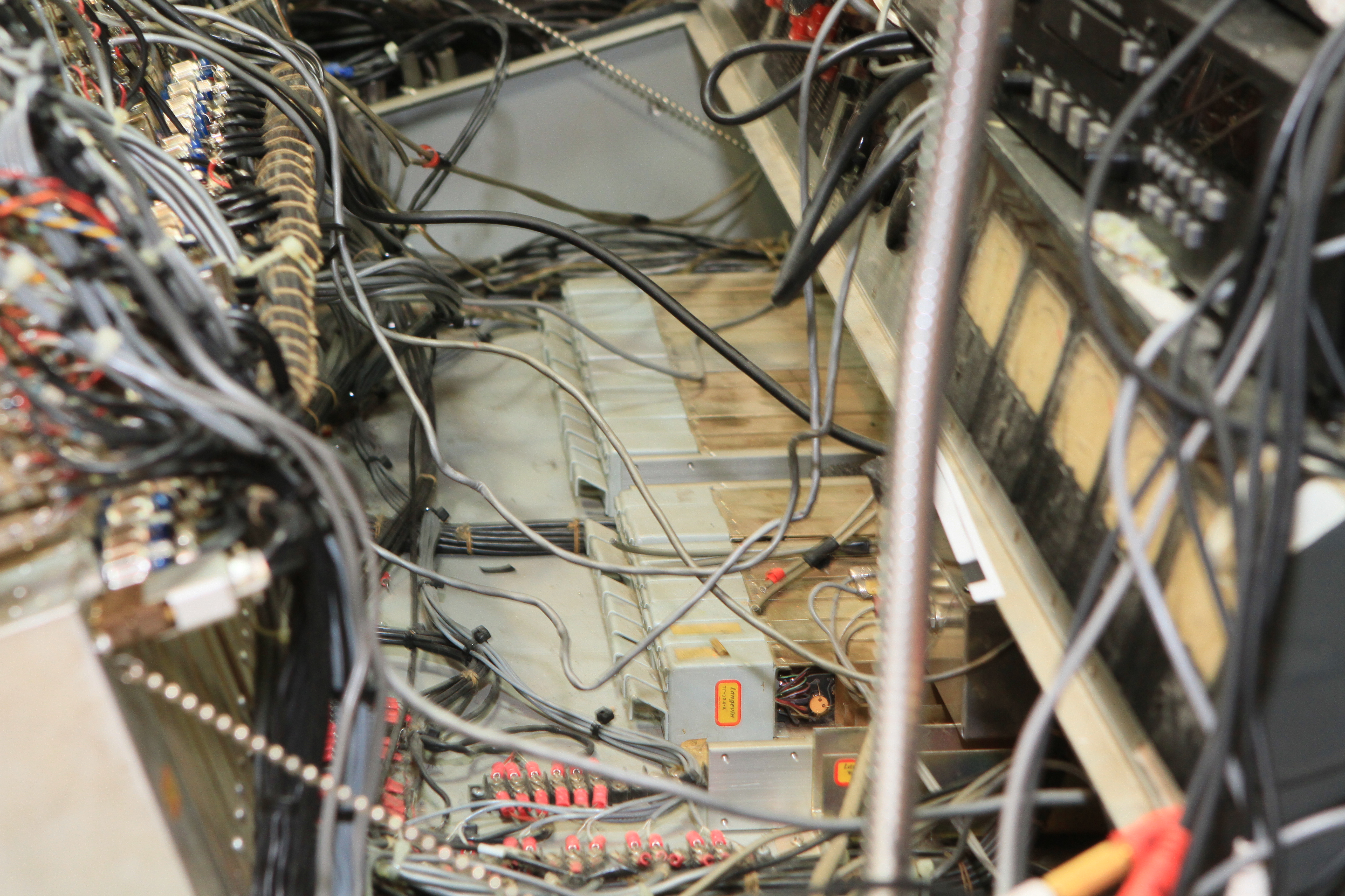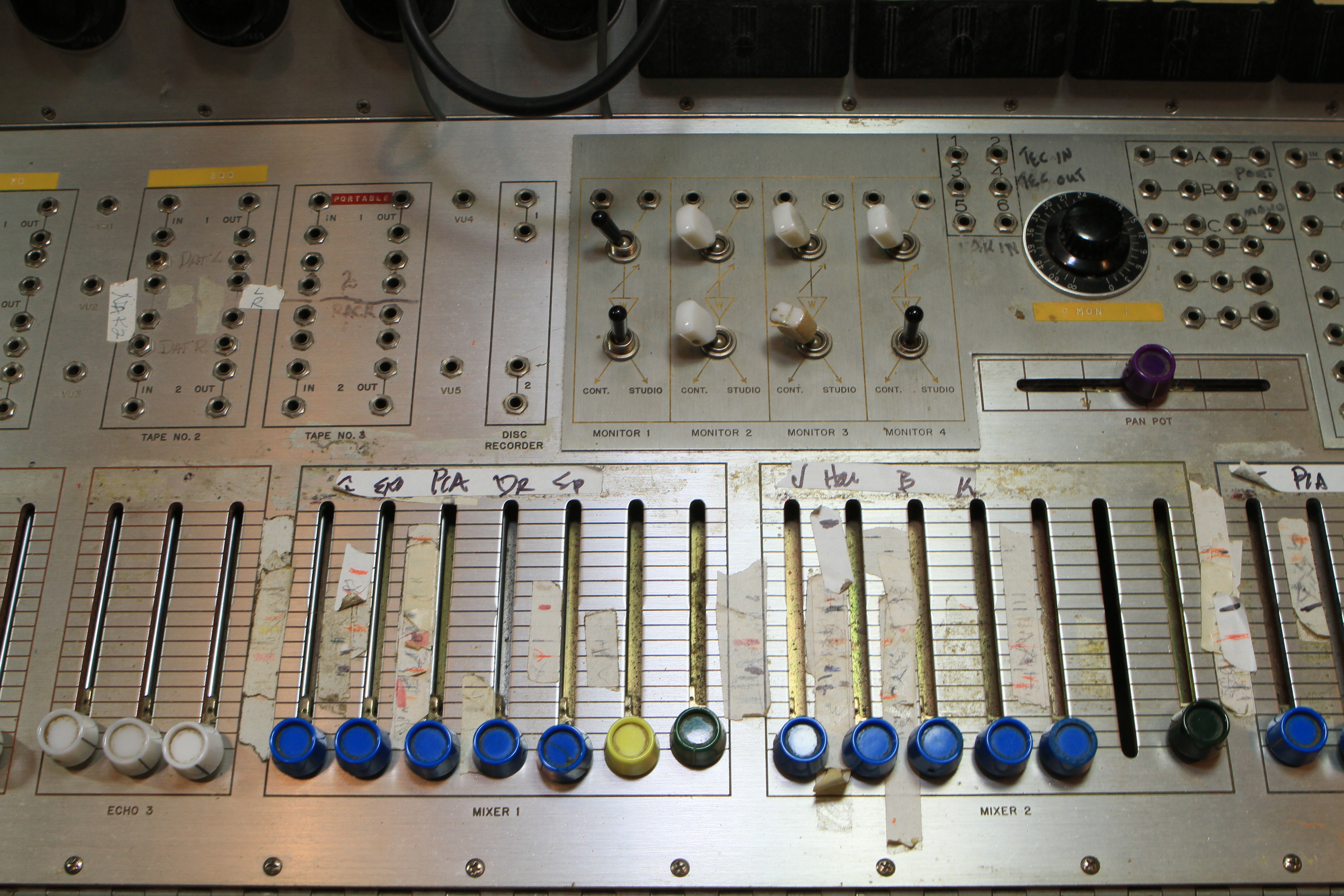 The ConsoleKearney's console was custom made for him by Glenn White Jr. and Ken Heidt using Langevin components. It's a classic piece of minimalist engineering. I needed to document the mixer/console so it could be sold. This is a really unusual piece because there isn't any switching; the signal flow diagram is engraved into the panel, and all of the signal flow is via TT patch cords. This is really intuitive to anyone with any signal flow sense, and probably completely impenetrable by anyone who really doesn't understand signal flow. In it's usual operating mode, STUN, it's covered with patch cables, and only the area where the faders are is really accessible. There's no per-channel equalization because even the Langevin 251 program equalizers were $270 and the EQ253 graphic equalizers were $600... and those were in 1963 dollars! Thus, this mixer has 2 graphic equalizers and 3 program equalizers, and you patch them in where they are needed. The result is a mixer whose signal path is about as minimalist as you could ever make, and there's no extra BS anywhere. This suited Kearney's style to a T. Finally, don't forget that in 1965, when this mixer was built, the studio had a 3-track machine. It was some time before he got an 8-track, and that's as far as it ever went.The Rest of the StoryIn the end, nobody came forward with a serious Jones for this mixer, and it went on eBay. That got it the exposure needed to find someone to buy it. And buy it they did. Finally, in late April, I got the mixer crated, and it was shipped to its new home in Nashville, where it will go on making music for its new owner. Oddly, the new owner is a past resident of the Seattle area and knew about Kearney and the mixer.Someone asked why the mixer wasn't headed for EMP. I think that everyone involved really wanted to see it go on making music. At EMP, it would have just become another artifact, something to be seen but not heard. That's the hard way to check out of this world. |