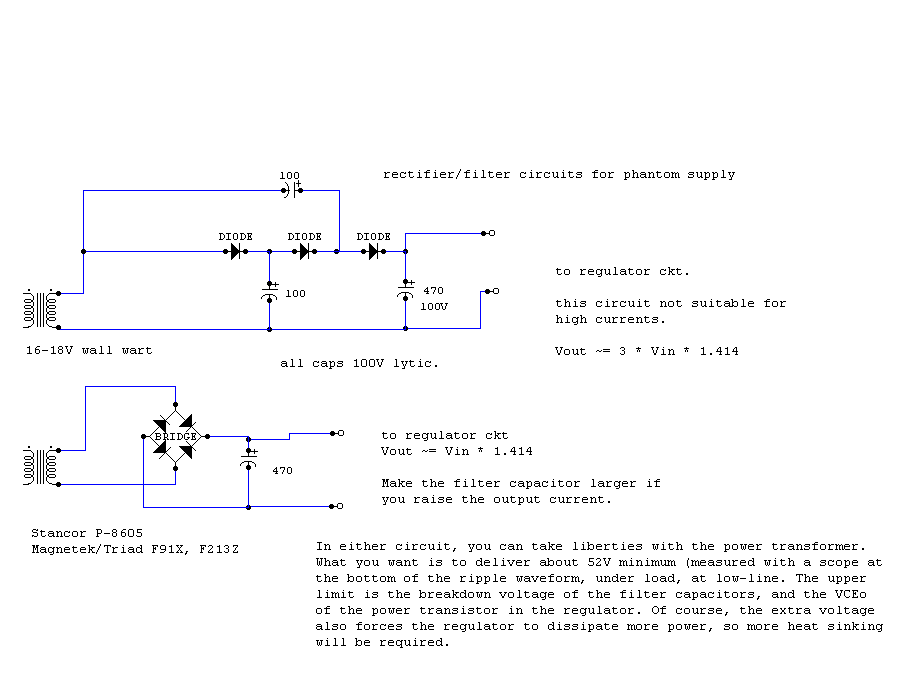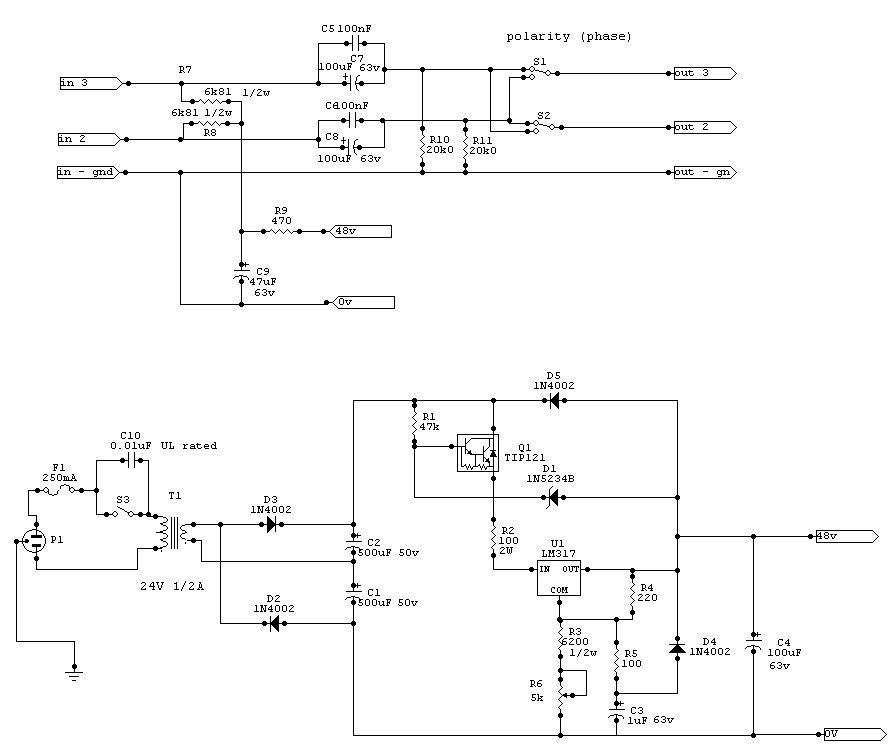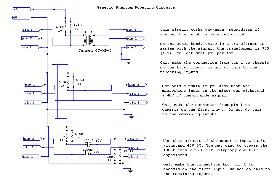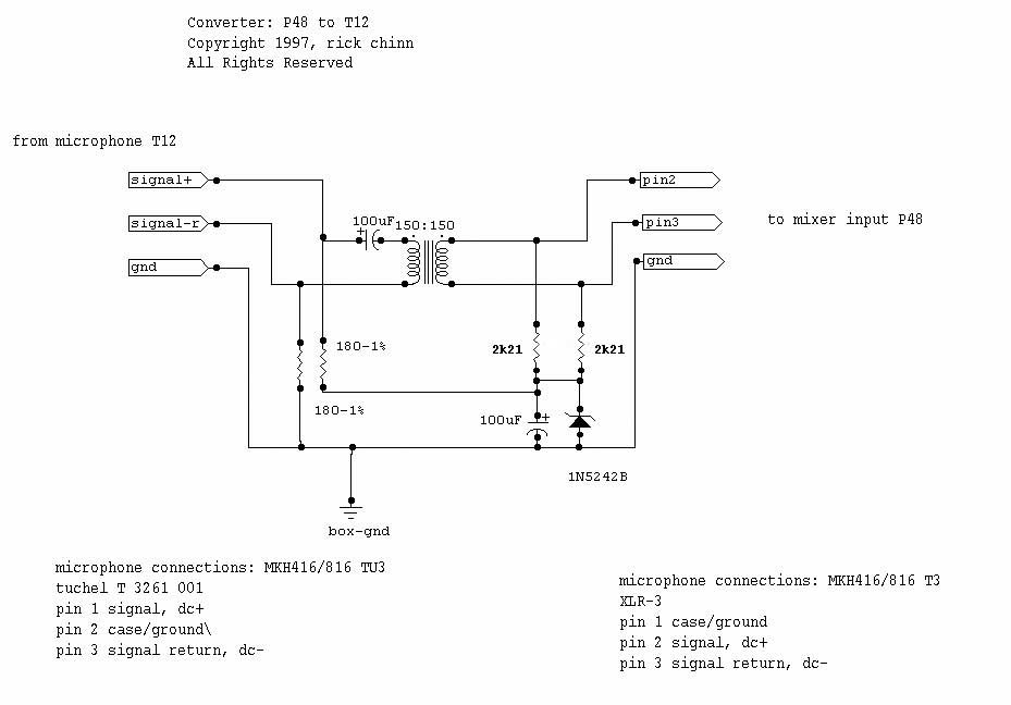 In the middle of 1965, Schoeps introduced the CMT 200 microphone. An RF condenser design, it was powered by 12v, supplied to the microphone via the mike cable using a phantom circuit. This is the first known usage of a phantom circuit for microphone powering[1]. Sometime around 1970, Neumann introduced the Fet-80 series of condenser microphones that were solid state and remotely powered via the microphone cable. In typical German fashion, they decreed that these microphones were the be-all and end-all to microphones of any sort, and they promptly discontinued all of their vacuum tube microphones. Of course, nearly 40 years later, we know different, with the venerable U47 now selling for the price of a car. Here then, are a series of articles, that explain this important concept and how it works. BTW, Neumann "gave" the idea to the industry; they claim that they trademarked the term, phantom power, and gave the concept and the term to our industry. There! Something for free from Neumann! (But as you can see, Schoeps beat them to the punch, however it was Neumann who standardized the value at 48V.) About that time (1965), another (non-compatible) system for powering condenser microphones via the microphone cable was in use. This system is known as T-System, A-B Powering or Modulation Lead Powering. Phantom powering uses pins 2 and 3 of the XLR for the postitive side of the power supply, and pin 1 of the XLR for the negative side of the supply. T-powering puts the power source across pins 2 and 3, with pin 1 only serving as the shield conductor. |